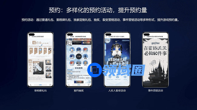 在预热曝光上,华为游戏中心推出了新游预约服务。一方面华为游戏中心为新游戏上架提供多种预约展示效果,如:详情页预约、H5页面预约、自定义界面预约等;另一方面,华为游戏中心也通过普通礼包、里程碑礼包、独家定制礼包、抽奖、裂变营销活动、事件营销活动等多样化预约活动,提升玩家参与度,强化认知。
