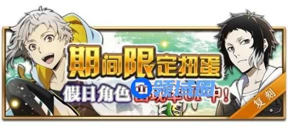 活动时间:4月3日13:00~4月10日12:59(8天) ①期间限定扭蛋:SSR【休日】中岛敦、 SSR【休日】芥川龙之介、SR【休日】谷崎润一郎、SR【休日】梶井基次郎 ②阶段上升扭蛋:到达第二阶段可获得SR特别兑换券*1,到达第五阶段必得SSR*1,到达第七阶段可获得SSR特别兑换券*1,到达第八阶段SSR出现率高达1.5倍且不限次数! SR特别兑换券:可在SR【休日】谷崎润一郎和SR【休日】梶井基次郎中任选其一进行兑换SSR特别兑换券:可在SSR【休日】中岛敦和SSR【休日】芥川龙之介中任选其一进行兑换。
