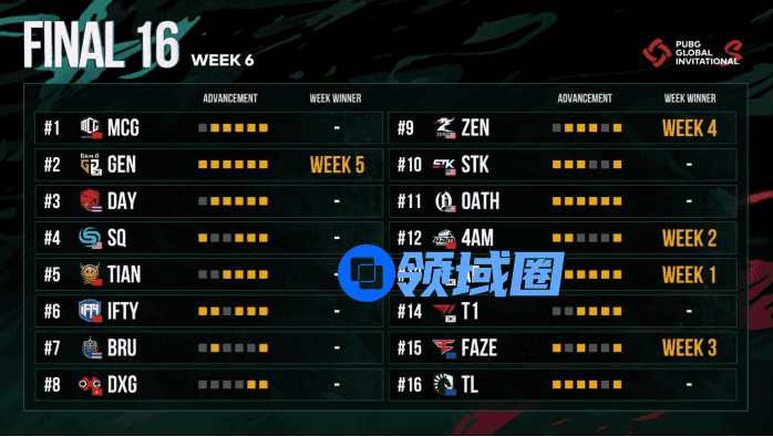经过周中赛三天的厮杀,成功脱颖而出晋级周决赛的PCL战队是MCG、TIANBA、iFTY、4AM。在第六周的周决赛名单里,前五周周冠军均悉数就位,他们将共同争夺最后的总冠军之位。