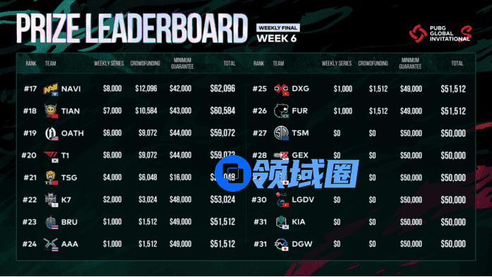 比较遗憾的是本周Tianba战队虽然成功进入周决赛,但是关键时刻未能很好地把握住机会,最终他们以60,584美金的奖金结束了自己在PGI.S的旅途。PeRo和TSG则分别获得了66,632美金和26,048美金。