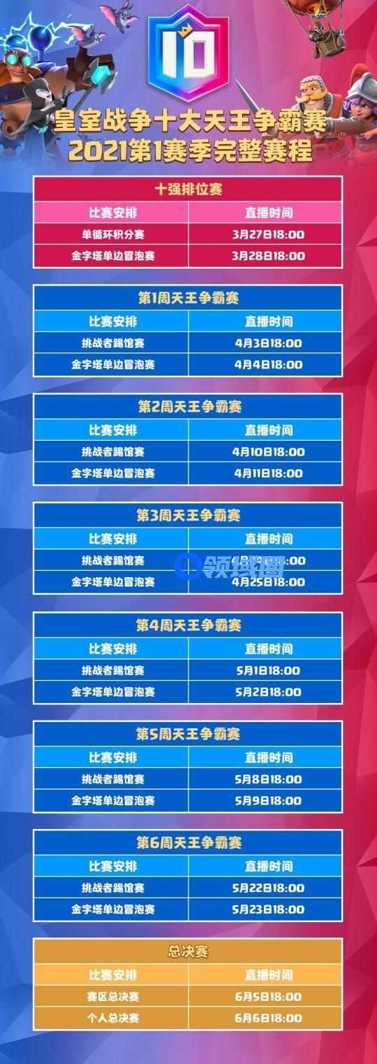 2021赛季,皇室电竞翻开新的篇章,华丽回归的CRL个人赛取代了团队赛,皇室电竞重回最经典的1V1模式,全球所有玩家同场竞技,全年总奖金更是突破1000万人民币。但一个CRL显然并不能满足全球亿万皇室粉丝的观赛热情,在5年的沉淀后,Supercell以差异化和个性化为前提,又倾力打造出一项全新的洲际赛事品牌——皇室战争十大天王争霸赛,荟萃全亚洲顶级高手,全新金字塔淘杀赛制,3V3团队模式彩蛋回归,全年两次盛大的总决赛,必将给玩家们带来焕然一新的观赛体验。本周六18点,十大天王赛将迎来全球首播,虎牙、斗鱼、哔哩哔哩等主流直播平台将同步直播,与你一起见证首周最强天王诞生!