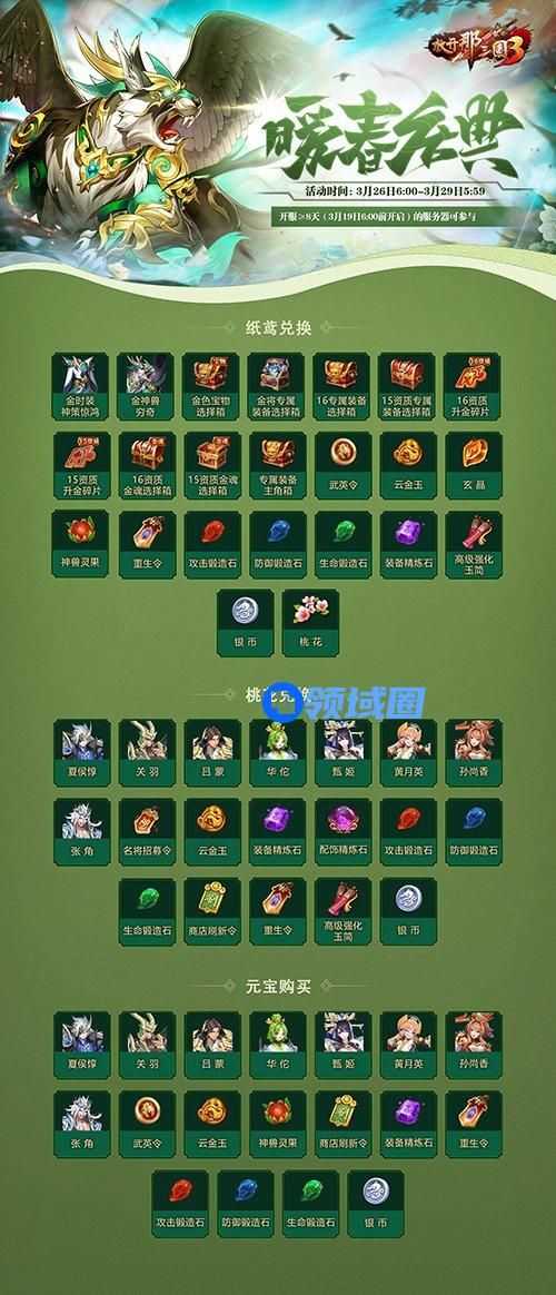 3月26日6:00-3月29日5:59期间,玩家参与暖春盛典活动可以获取道具「桃花」、「纸鸢」。「桃花」可用于兑换三国名将、武英令等多种稀有资源,强大阵容征战更轻松。「纸鸢」可用于兑换金色神兽-穷奇、金色时装-神策惊鸿、装备升金石等超值福利,大量属性增益、全新技能效果等让你如虎添翼!