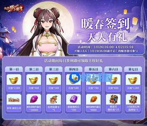 不仅如此,在3月26日6:00-4月2日5:59期间登录游戏,每天都能领取惊喜福利,超6000元宝、暖春定制称号-烟花三月和16资质武将选择箱等海量福利人人皆可带回家!