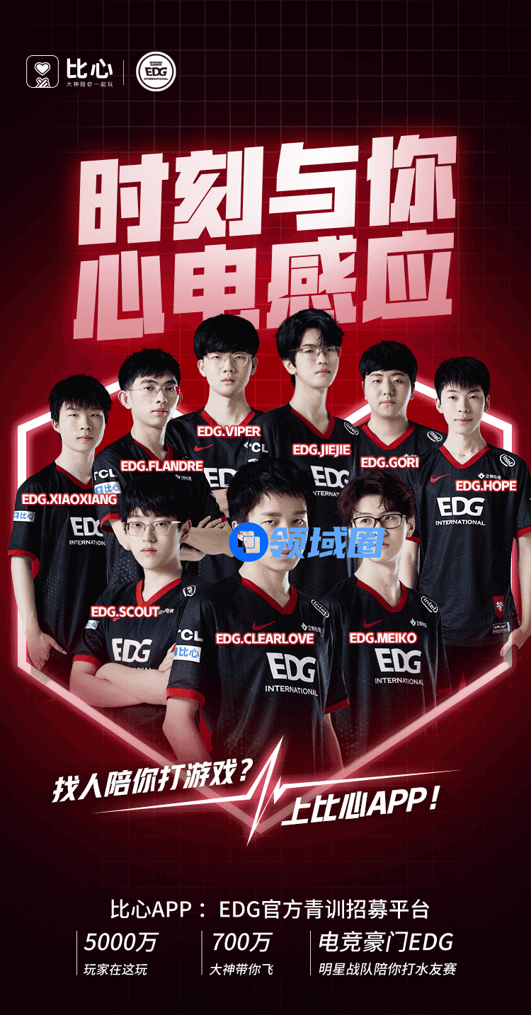 EDG电子竞技俱乐部成立于2013年,拥有英雄联盟、王者荣耀、绝地求生等数个电竞分部,在各个游戏的电竞领域都取得了不俗的成绩。本次比心成功签约的EDG电子竞技俱乐部英雄联盟战队,曾经在2014年取得LPL春季赛 、夏季赛冠军,次年取得LPL春季赛冠军、MSI季中邀请赛冠军。随后,EDG在2016年取得LPL夏季赛冠军,达成德玛西亚杯五连冠,在2017年LPL夏季赛上EDG再次斩获冠军。2021LPL春季赛,经过了人员调整的EDG开赛便打出了8连胜的优秀成绩,稳居积分榜前列,是春季赛实力最为强悍的队伍之一。