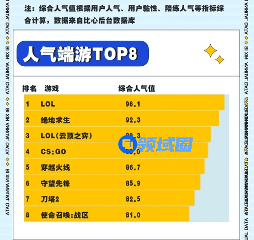 在比心公布的《2020比心人气游戏榜》中,根据用户人气、用户黏性、陪练人气等指标综合计算后,LOL以96.1的综合人气值牢牢占据人气端游TOP1的位置。