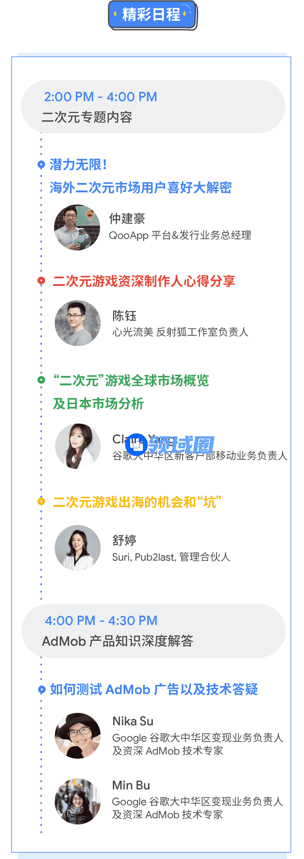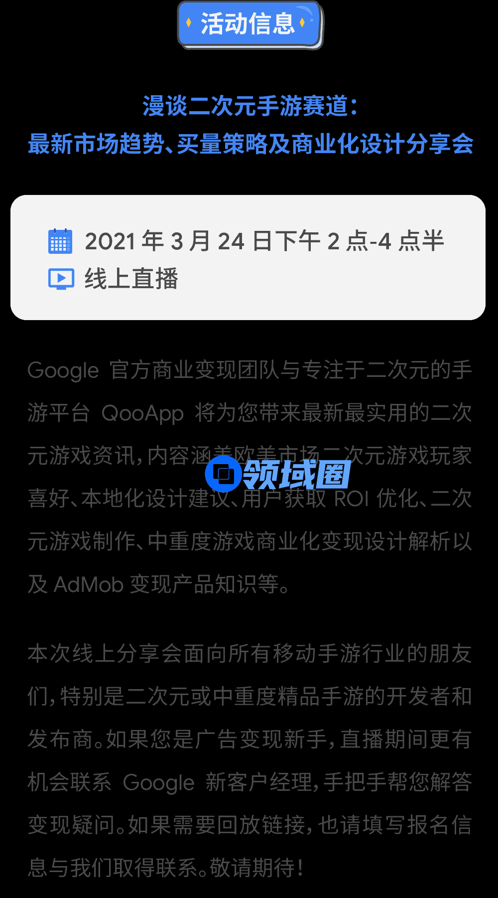 3 月 24 日,Google 官方商业变现团队与专注于二次元的手游平台 QooApp 将通过在线形式为您带来二次元游戏出海的全盘解析。话题内容涵盖欧美市场二次元游戏玩家喜好、本地化设计建议、用户获取 ROI 优化、二次元游戏制作、中重度游戏商业化变现设计解析以及 AdMob 变现产品知识等。活动邀请资深游戏制作人和二次元行业专家,从自身多年研究此赛道的角度,为游戏行业的朋友们带来干货满满的解读。
