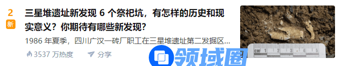 热度的源头主要是因为在今天(3月20日)成都召开的“考古中国”重大项目工作进展会上,官方公布了考古学者在三星堆遗址新发现6座三星堆文化“祭祀坑”,并出土金面具残片、巨青铜面具、青铜神树、象牙等重要文物500余件。