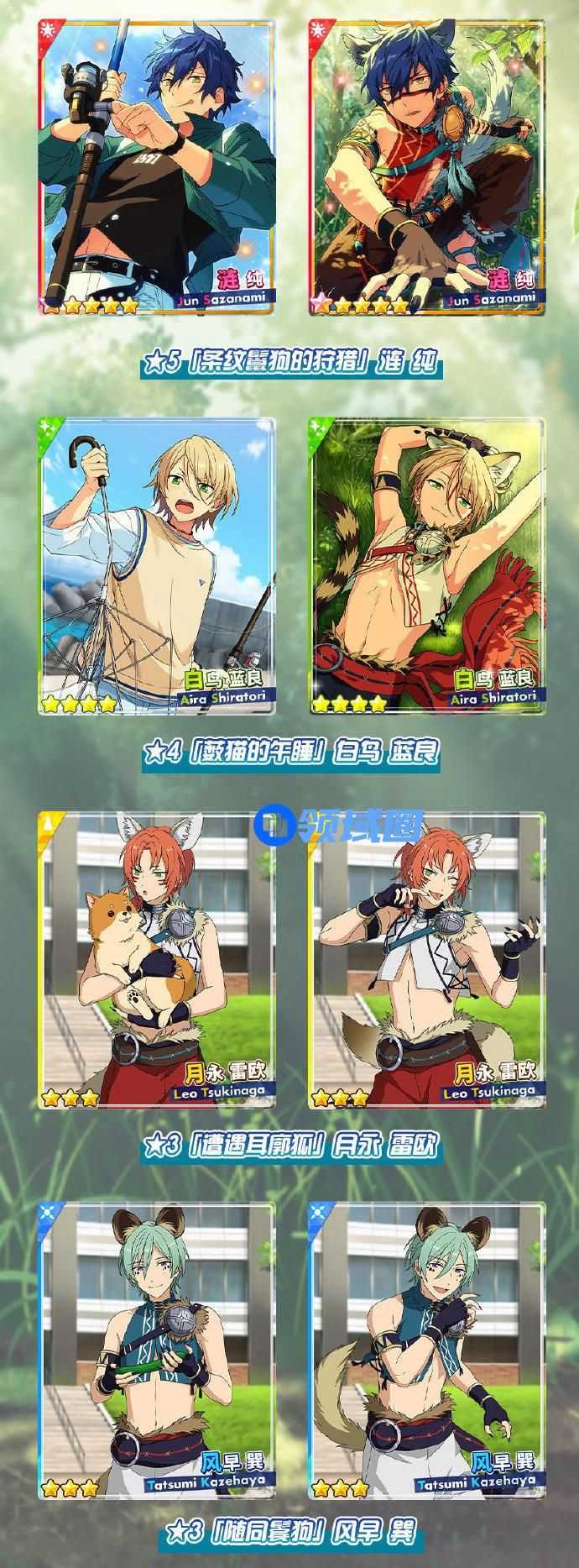 全新限定卡池「招募!草原兽荒野求生」目前已经正式开启,将于3月12日11:59结束。5【条纹鬣狗的狩猎】涟纯、4【薮猫的午睡】白鸟蓝良、3【遭遇耳廓狐】月永雷欧、3【随同鬓狗】风早巽,活动卡牌在活动卡池掉率提升!