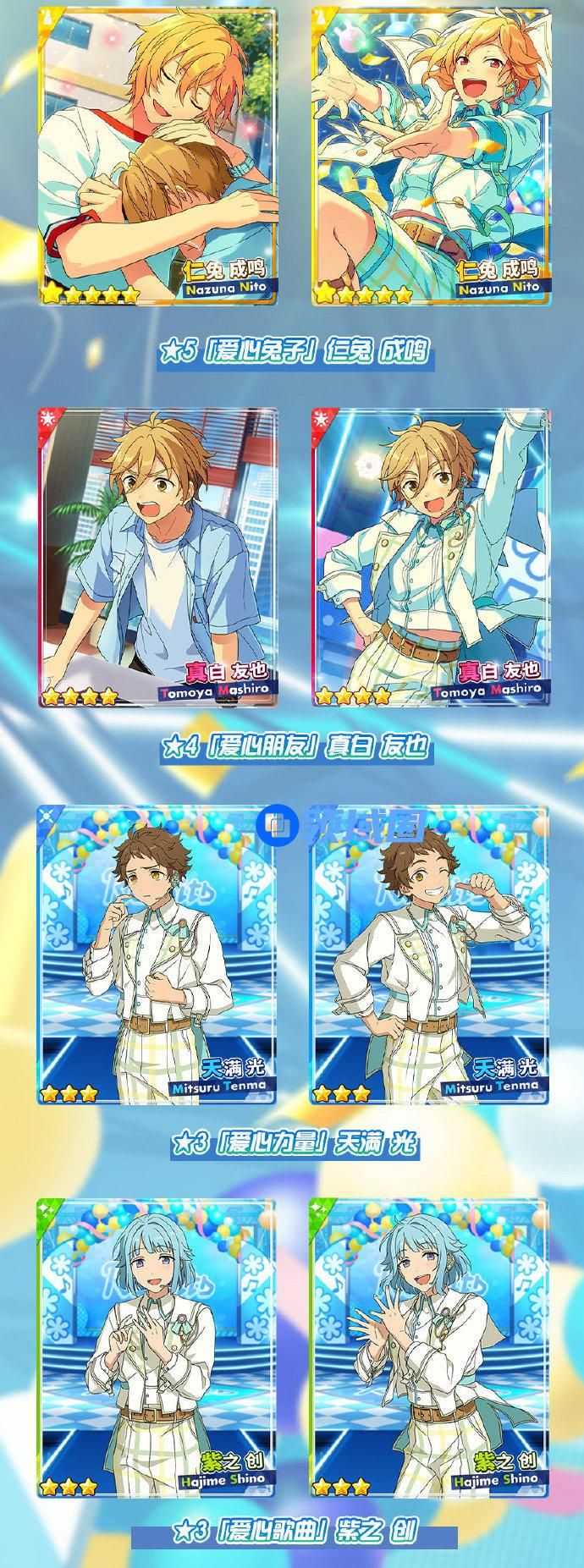 本期演唱会活动奖励卡片均附有MV服装+房间服装:活力派对服装。5【爱心兔子】仁兔成鸣2次突破附带SCR房间服装,满破附带SCR-MV服装。