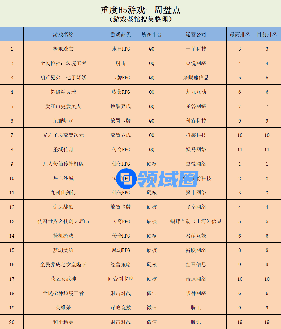重度H5游戏:《极限逃亡》登上榜首,《光之圣境放置次元》首次登榜