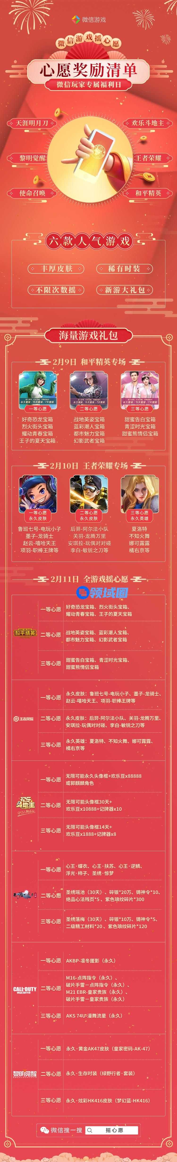 本次微信游戏联合腾讯旗下六款热门手游,包括王者荣耀、和平精英、欢乐斗地主、CODM、天涯明月刀和黎明觉醒,携海量礼品给各位玩家提前拜大年,官方心愿清单现已正式发布,你心仪已久的宝贝可能就在其中
