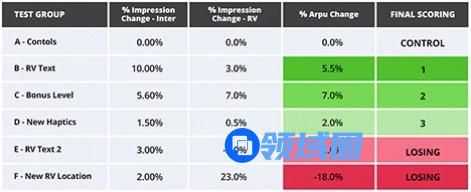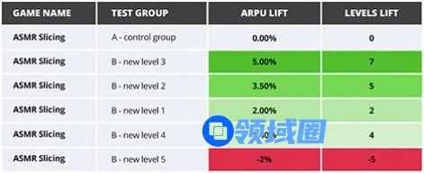 然而,随着我们对这款游戏新内容和新功能的测试,以及对游戏玩家喜好的不断监测和分析,使这款游戏到目前为止仍位居排行榜前列。从以下测试表可以看出,每当我们增加一个新的关卡,游戏的收益和玩家的时长都得到了相应的提升。当然,第3关凭借傲人的数据脱颖而出,也会当之无愧的被加入游戏中。这不仅是因为游戏的ARPU得到提升,还因为它使玩家平均多玩了7个关卡。