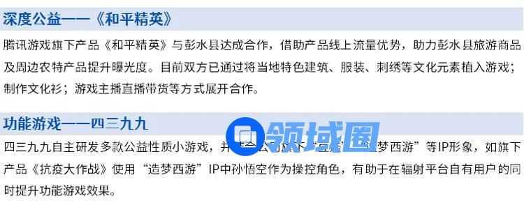 游戏企业进行公益活动的特点说明了企业对公益活动重视程度的加深,更为注重公益活动的连续性,同时与产品相结合也展现出游戏产业特有的社会责任履行方式,并拓展产业正向价值。例如腾讯游戏、西山居、四三九九等代表性企业深度布局公益层面。