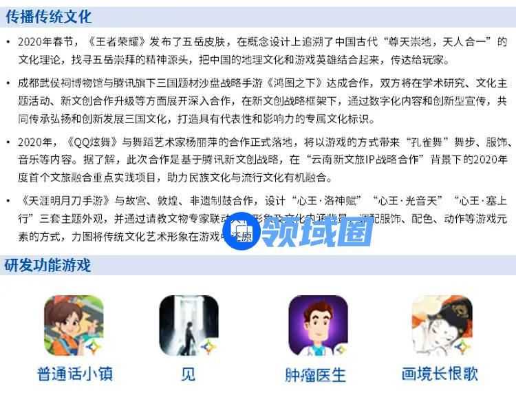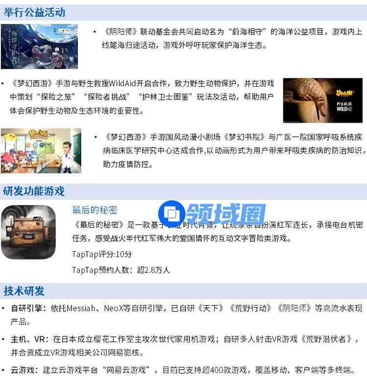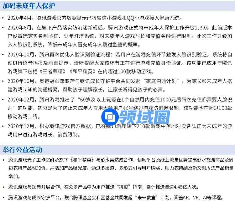 腾讯游戏旗下拥有众多用户基数大、黏性高的长生命周期产品,借助产品优势履行社会责任成为腾讯游戏较为突出的特点。腾讯游戏将保护产品内未成年用户做为履行社会责任的基本面之一,并从升级已有系统防护等级、延展接入防沉迷产品范围等方面发力,在业内表现较为突出。目前,腾讯游戏已引入人脸识别技术强化未成年人识别力度,并将微信小游戏、QQ小游戏等平台部分产品纳入监管范围,全年进行多重举措促进未成年人保护升级。公益方面,腾讯游戏开展“未来教室计划”“光子扶贫计划”等公益活动,并与语文出版社合作推出公益游戏《普通话小镇》、与医典合作在游戏中推送“抗疫”指南,此外,部分产品通过响应99公益日等活动号召的方式参与公益活动。传统文化方面,《QQ炫舞》《天涯明月刀手游》《王者荣耀》等多款热门产品与民族舞蹈、传统建筑、古典风景等对象进行联动,通过外观、玩法元素、音乐等方式传播传统文化。此外,腾讯游戏在研发功能游戏、技术研发等方面均有较为突出的表现,综合为企业带来较高评分。