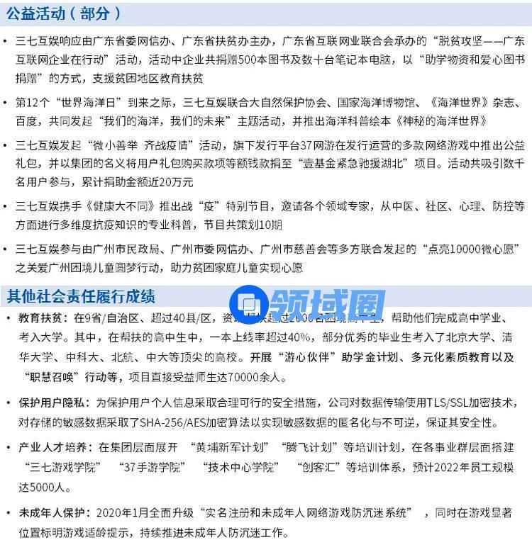 作为年营收超过百亿元的游戏企业,三七互娱拥有较强社会责任履行意识,连续多年发布社会责任报告,同时逐步扩大责任涵盖范围。公益方面,三七互娱内部成立专职公益活动的组织——“游心基金会” ,使公益活动覆盖到更多领域,同时积极与其他机构进行合作,扩大公益行为覆盖群体,这也证明三七互娱在履行社会责任上具备深度且长期的投入。同时,三七互娱人才培养方式较为成熟,通过内部多元培训体系提升员工能力,成果转化体现在技术机制,并作用于未成年人保护、用户隐私保护、研发水平提升等多方面。此外,2020年三七互娱发力功能游戏研发,已上线《叹西关》《拯救野生动物》《消毒大作战》《这是什么垃圾》《牡蛎礁保卫战》等多款功能游戏,持续关注社会问题。多方面履行社会责任,为三七互娱营造了较为良好的社会形象。