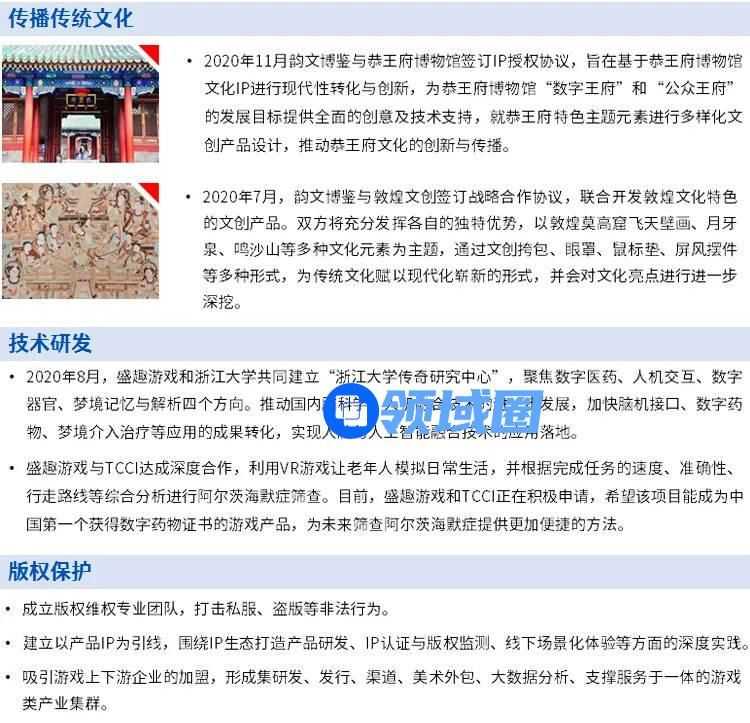 世纪华通在传播传统文化、技术研发等方面取得较高得分。传播传统文化方面,世纪华通旗下子公司盛趣游戏创立文化生态圈品牌“韵文博鉴”,目前已与包括南海博物馆在内的约350家博物馆、千余名非遗大师达成协议,并已完成了30000多件核心文物数字采集。技术研发方面,世纪华通子公司盛趣游戏依托技术优势探索游戏在科技领域的应用,已与浙江大学签订协议共建前沿科技研究中心,并与TCCI达成深度合作,尝试用游戏为筛查阿尔茨海默症提供更加便捷的方法。此外,作为《传奇》游戏在中国地区的独占权权利人,世纪华通子公司盛趣游戏也对版权保护着手进行规范,首创IP共享经济模式,围绕核心IP实现知识产权的保护与发展,同时建立以产品IP为引线,围绕IP生态打造产品研发、IP认证与版权监测、线下场景化体验等方面的深度实践。