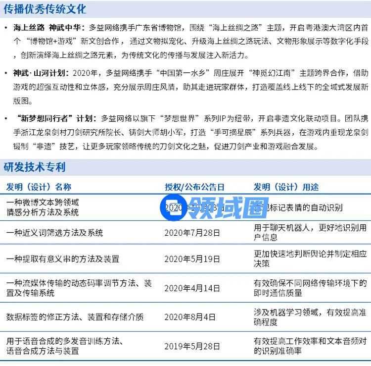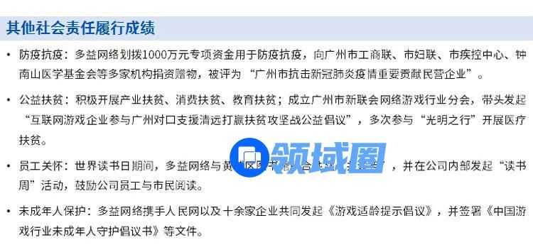 多益网络从人才培养、文化传承、公益实践等多方面履行社会责任。人才培养方面,多益网络通过开展校企联合积极布局校招,并内设多益学院、多益技术研究院等支持平台,帮助员工提升专业技能,驱动创新发展。人才团队的培养与建设,进一步夯实公司研发实力,目前多益网络已组建多条产品生产线,覆盖不同品类,并积累多项技术专利,直接或间接作用于产品研发、改善游戏产业环境,形成良性闭环。旗下《神武4》等经典IP深耕新文创,已摸索出有效打通游戏内外、传承弘扬中华优秀传统文化的经验做法,并取得一定社会成效。此外,公益是企业的关注焦点之一,通过捐资赠物、举办主题活动等方式践行企业社会责任,涵盖防疫抗疫、扶贫攻坚、员工关怀、未成年人保护等多个方面。