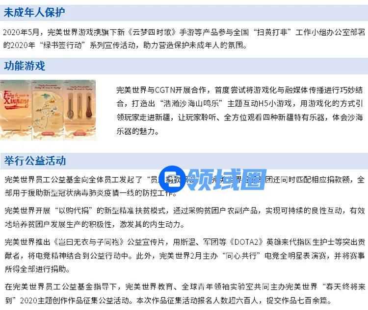 疫情期间,完美世界影视、游戏、电竞、动画、教育等业务通过捐赠播放权、推出公益宣传片、公益性质电竞表演赛及作品征集等多项活动,以文创+公益的方式,通过较为丰富多元的数字文化产品娱乐用户生活,助力抗击疫情。传统文化方面,完美世界游戏旗下多款头部产品展开文化联动,包括但不限于“国风服饰”“京剧艺术” 等联动对象,加之企业旗下产品用户量级较高,活动可覆盖用户范围得以扩大。同时,完美世界在产品出海版本中也开展文化联动活动,凭借企业在部分海外地区取得的市场知名度,助力中国传统文化出海。此外,完美世界在技术研发、功能游戏、未成年人保护等社会责任领域也有布局,在各个评分维度均取得较优得分。