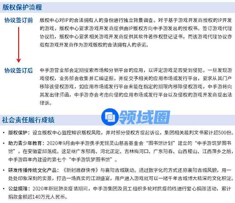 中手游旗下产品以IP游戏为主,并与多个版权方保持良好合作,目前旗下拥有IP数量超百个,基于成熟的版权运作经验,助力版权保护成为中手游履行社会责任的方向之一。一方面,中手游对授权IP有较为严格的把控流程,对IP授权方资质及代理发行产品IP状况均会进行调查,从源头减少IP侵权风险。另一方面,中手游会自发监测获得授权的IP是否遭到侵权,有利于净化产业环境。此外,中手游也通过其他方式履行社会责任,如助力青少年教育,目前已建成7家“中手游筑梦图书馆”,辐射人数达数千人;疫情期间,集团与员工的爱心捐款超140万元人民币;研发《仙剑奇侠传七》《轩辕剑:剑之源》《新雕侠群侠传之铁血丹心》等游戏,传播中国武侠文化。