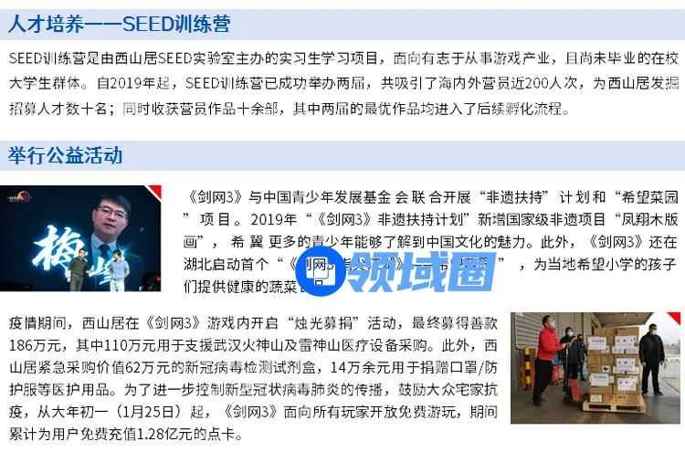 西山居旗下“剑侠情缘”IP已有超20年历史,较为深厚的内容底蕴转化形成良好的游戏生态,也成为西山居履行社会责任的重要出发点。一方面,西山居不断提升自身美术要求,探索中国传统艺术与现代美学的有机融合,为用户带来新颖的视觉体验;另一方面,西山居成立人才培养体系,为产业输送人才,目前已建立西山居美术中心人才选拔、SEED训练营等多个培训体系,面向社会人士、学生等不同受众群体。除此之外,西山居不断深化技术实力,其在云计算、自研引擎等方面的沉淀,推动西山居云游戏、主机单机等领域产品研发,助力服务用户需求。目前,《剑网3》云游戏已展开PC云端测试,单机产品《谢云流传》也在研发过程中。西山居同样发力公益活动,如与中国青少年发展基金会联合开展了非遗扶持和希望菜园项目;在疫情期间助力驰援灾区,并发放点卡鼓励玩家宅家抗疫。