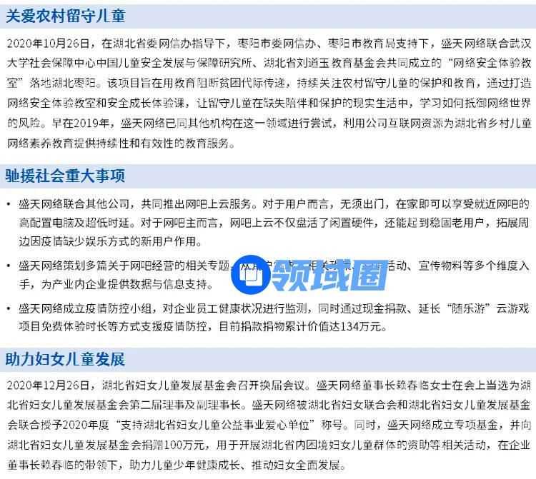近年来,盛天网络已在文教、卫生、扶贫、关爱特殊人群等多个领域践行社会责任。2020年,盛天网络联合多部门,共同发起“城乡儿童网络安全素养教育与保障结对帮扶项目”活动,旨在用教育阻断贫困代际传递。同时,盛天网络重点关注妇女发展及儿童健康,并成立专项基金,未来有望持续加码本项公益活动。此外,盛天网络在疫情期间依托网吧及技术优势,联合其他企业共同推出网吧上云服务,将网吧的实体PC算力通过基础网络整合至云端,使得用户可不受场景限制使用高配置电脑,助力网吧产业发展,并探讨未来可能的业务形态,依托优势深度服务于产业发展。同时,这一举措有助于用户响应“宅家”号召,降低外出感染风险。目前,盛天网络已推出多项举措助力疫情防控,累计捐款捐物已达134万元。