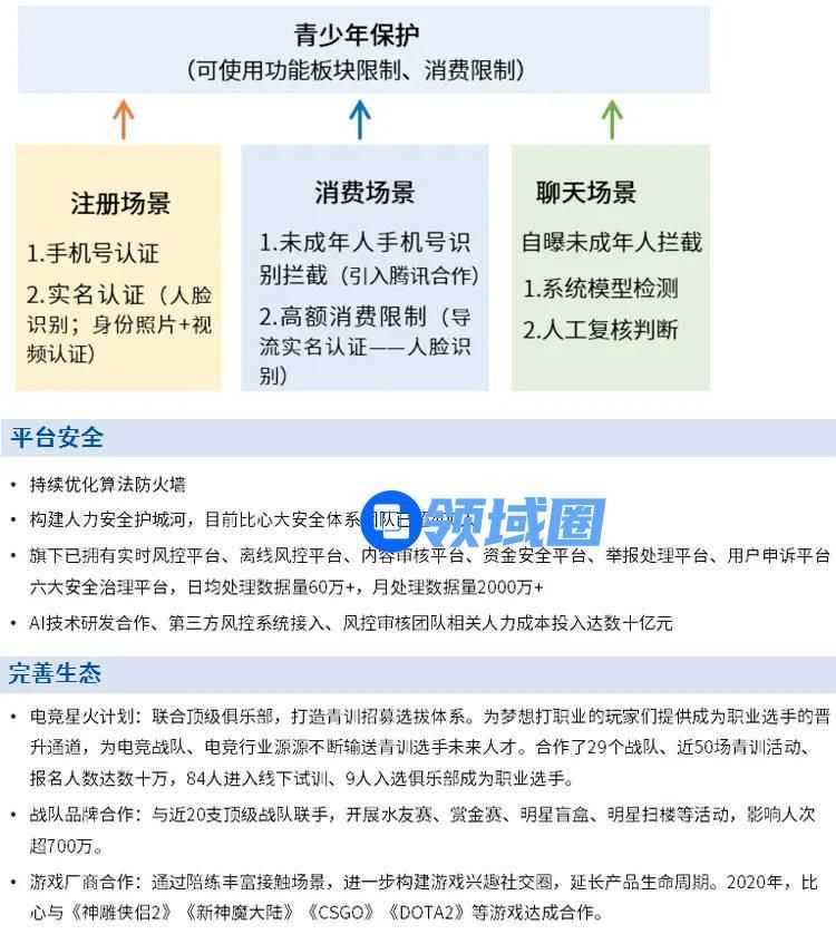 比心在促进就业、未成年人保护等项目得分较高,同时在相关报道中“完善产业生态”“强化平台治理”等履责方式均被提及。促进就业方面,比心借助自身业务模式探索线上电竞陪练师职业,或可对现有电竞相关职业进行补充。一方面,电竞陪练师同样以游戏技术水平作为职业核心,有助于对年轻游戏用户产生较强吸引力;另一方面,电竞陪练师有助于降低从业者产业入门门槛,同时职业具备就业灵活等差异化优势,允许从业者通过线上方式入职,促进在线新经济就业模式探索,助力缓解社会就业压力。同时,比心通过协助起草职业标准等方式推动职业规范化,为从业用户提供更多保障。未成年人保护方面,比心已接入腾讯公司的未成年人识别系统,对未成年人消费、功能使用范围等方面进行限制,同时开发专用处理流程,对未成年用户相关客服申请进行优先处理,加码社会关切问题。此外,比心在数据安全、平台环境、产业生态等方面同样展开布局,从多方面履行社会责任。