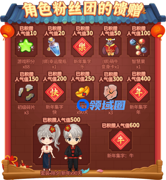 角色粉丝团的馈赠:玩家积攒的人气值越高,可领取的奖励越多!