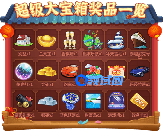 11. “超级大宝箱”中,获得“金元宝、金砖、银砖”几率合计:5%,获得“摇滚乐队、玫瑰花海、财富岛、泰坦尼克号”几率合计:30%,其余奖品获得几率合计65%。