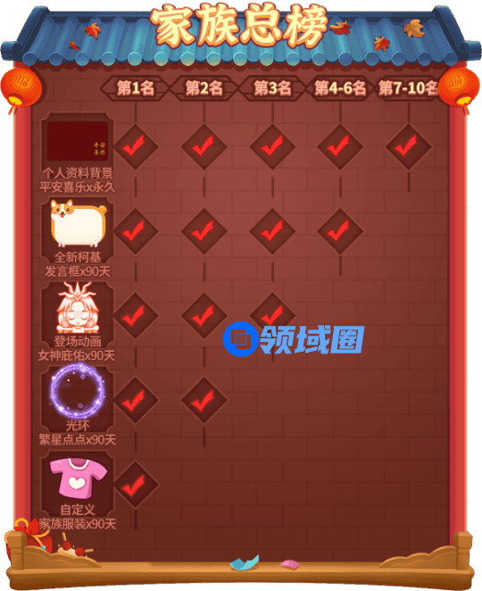 例:活动结束后排名第3的家族中,在活动期间累积获得100“热闹指数”的所有族员都能获得“个人资料背景·平安喜乐”x永久、柯基发言框x90天、女神庇佑登场动画x90天作为奖励!