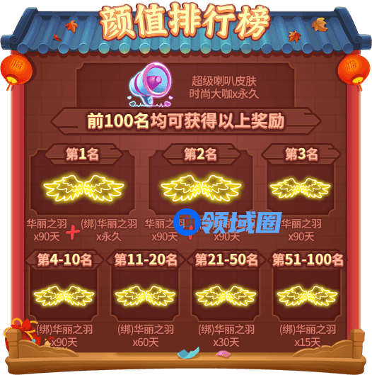 活动结束后,位于“颜值排行榜”前100名玩家将能够获得如下奖励: