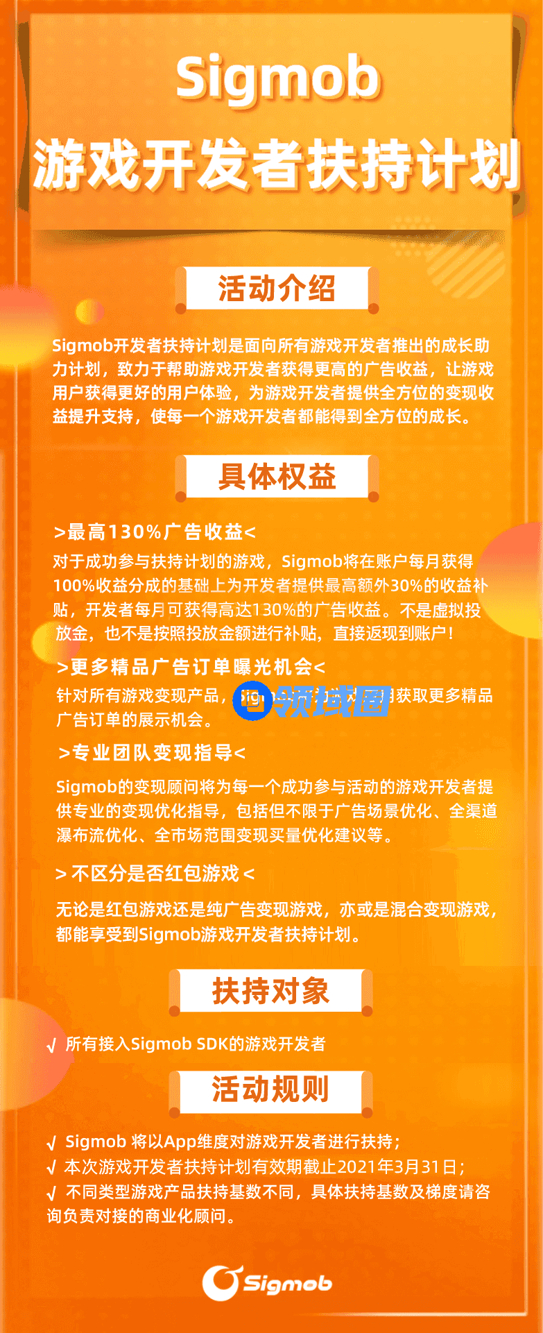 针对这一现状,2021年伊始,Sigmob正式推出了“游戏开发者扶持计划”,对Sigmob合作中的游戏全行业开发者伙伴进行扶持激励,无论你是做网赚红包游戏还是做纯广告变现游戏,亦或是即将向混合变现游戏转型,Sigmob都将帮助提升收益,助力游戏开发者成长!