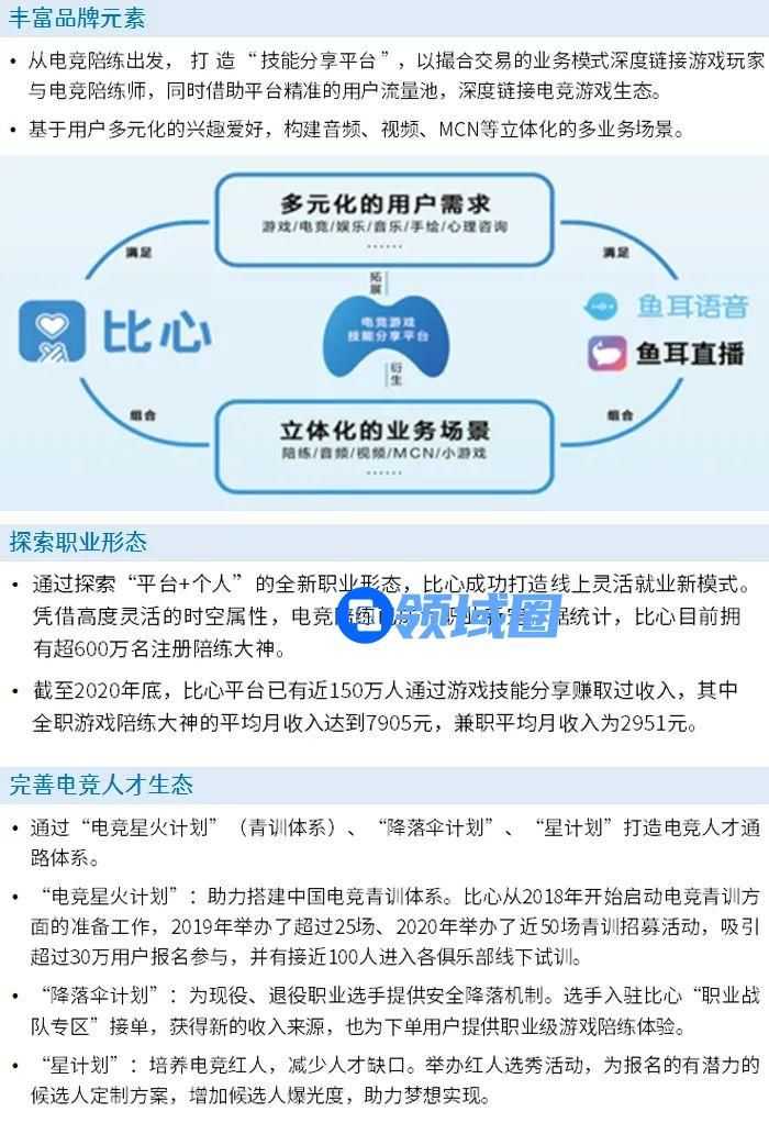 比心以“电竞社区”作为业务开展的核心,并基于此在多个领域展开多元化业务拓展。比心以电竞游戏技能分享为原点,开设品类近百项,布局主机、单机等多终端产品,形成热门、多元产品矩阵的品牌标签,吸引不同偏好用户关注。同时借助自身用户流量池,比心深度链接电竞产业生态,输出专业人才,建立行业标准,完善职业教育,在为用户创造灵活就业机会的同时,也为其提供专业化、职业化、多元化的发展路径。一方面,比心推行“平台+个人”职业形态,推动电竞陪练师行业标准建设,助力打造新型经济就业模式,通过“游戏”“收入”“灵活”等关键词吸引众多游戏高玩入驻,提升用户满意度,进而吸引更多泛用户加入。另一方面,比心通过打造“电竞星火计划”“降落伞计划”“星计划”,以及电竞教育校企联动,为企业增添“人才培养”“就业”等多维度品牌标签,形成可持续的人才生态闭环。此外,比心基于用户“技能分享”需求洞察进行全新业务尝试,推出鱼耳语音APP和鱼耳直播APP,通过构建音视频等不同在线互动交流场景,为用户提供更丰富的技能展示空间,拓展品牌元素丰富性。多种方式共同作用,较大程度提升了比心品牌知名度,目前平台注册用户数量已超5000万。