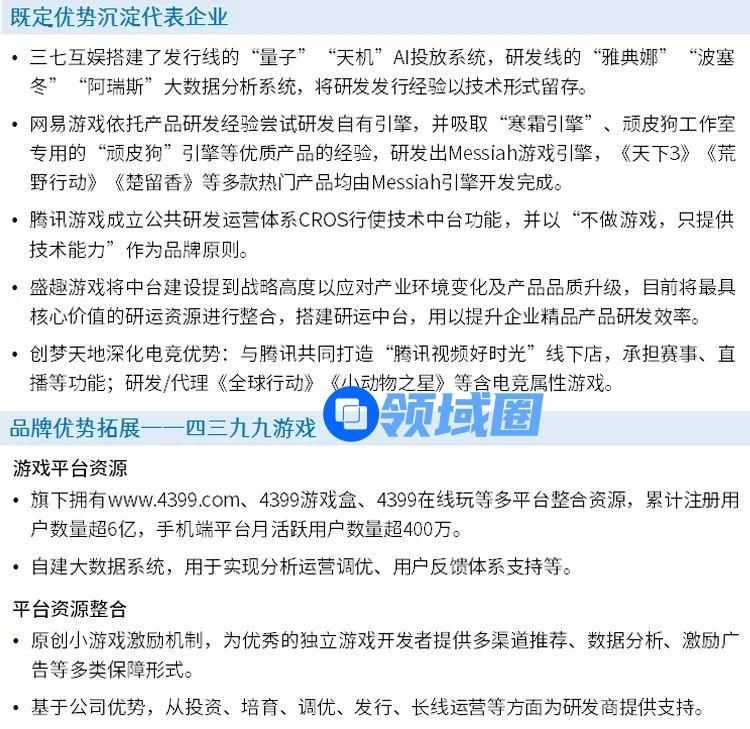 围绕用户平台进行品牌延伸基于历史产品,部分企业在单一或多元维度已形成独有的品牌优势,而围绕优势进行布局有助于扩大品牌影响力。一方面,企业可以将已有优势与技术手段相结合,通过构建数据平台、搭建技术中台、自研游戏引擎等形式实现优势留存,并为品牌后续延伸进行储备,腾讯游戏、三七互娱等企业是这一布局方式的典型代表,另一方面,企业也可围绕用户层面拓展品牌优势,将自身业务与相关领域相结合,通过招募创作者、挖掘用户潜在需求等方式吸引可拓展用户,实现品牌延伸,目前已有四三九九、TapTap等企业或平台在这一领域进行尝试。