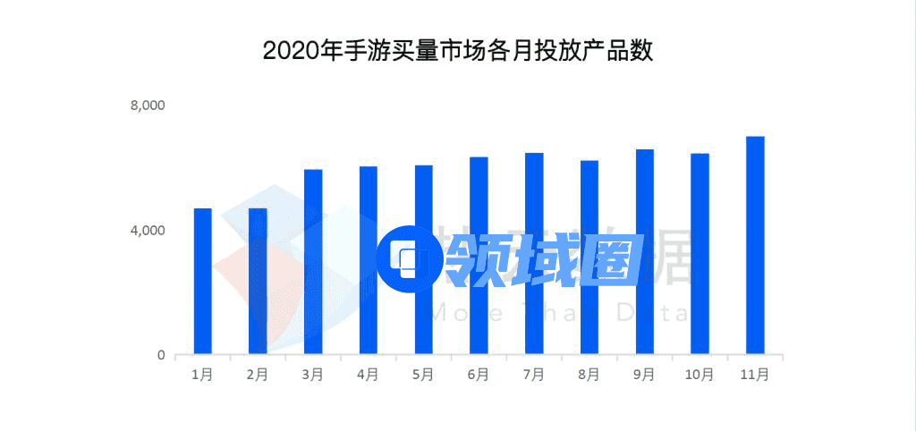 根据TopON与热云数据发布的《2020全球手游买量投放与变现报告》显示,2020年1-11月中国手游买量市场投放产品总数超过2万,与2019年相比,增长率近 47%,月均投放产品数约6千左右。