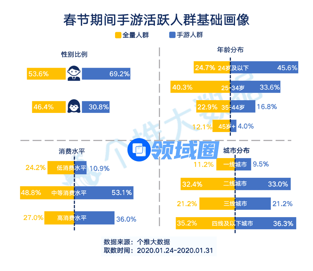 第三,消费机会。和其他App类型不同,手游行业的消费者玩家结构更加偏向年轻群体,在春节期间也依然保持着这个规律。消费水平上,手游玩家和全量用户均集中在中等消费水平。同时,手游玩家在高消费水平区域有更高的聚集,而在低消费水平占比相对较小,手游玩家整体消费水平要高于全量人群。