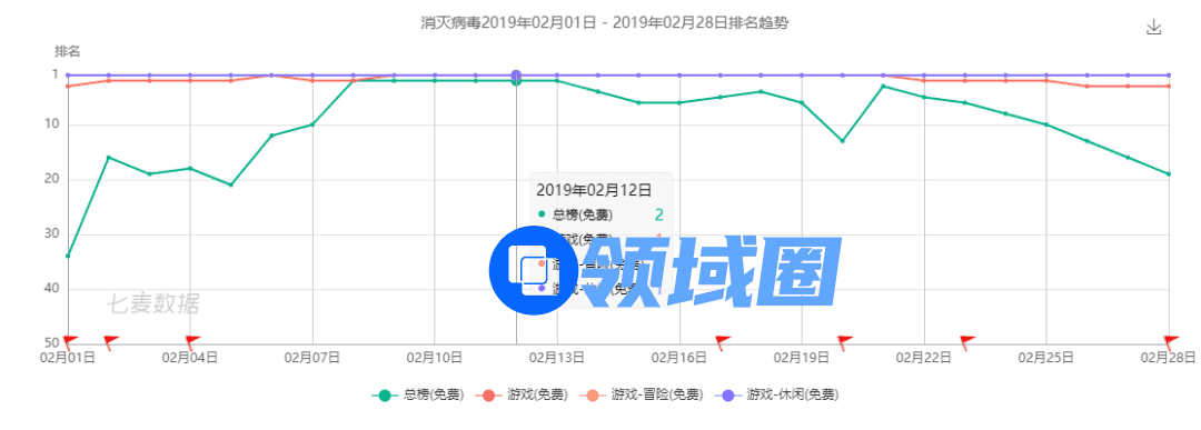 2019年爆款新品出现的概率并不高,《消灭病毒》算是其中最亮的“崽”。在进入2月的第一天, 《消灭病毒》就强势空降国内App Store游戏免费榜Top3,之后一路高歌猛进夺得榜首,坐稳了当期国内App Store游戏免费榜第一的宝座。