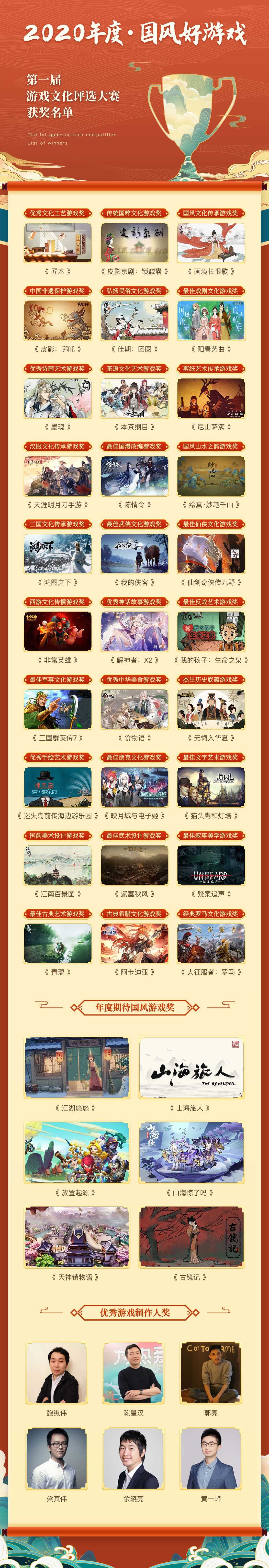在这次的“国风好游戏”游戏文化评选大赛中,共有32个奖项、总计高达42个获奖名单出炉。其中被评为年度优秀文化类奖项的游戏有30款,年度期待国风游戏有6款,并有6位游戏制作人荣获优秀游戏制作人奖。
