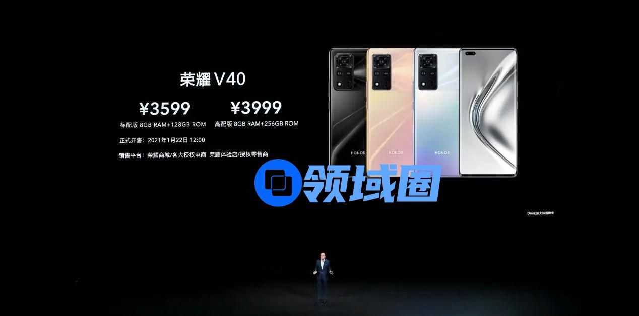 此次,荣耀V40共有幻夜黑、钛空银、蔷薇金三款全新配色,8GB+128GB、8GB+256GB两个内存版本,分别售价为3599元、3999元 ,将于2021年1月22日12:00在线上线下平台全面开售,用户可登陆荣耀商城及各大授权电商平台或前往荣耀体验店、荣耀授权零售门店进行购买。
