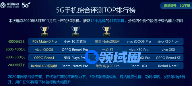 报告选取2020年6月至11月上市的5G手机,涉及12个品牌共41款,分四个价位进行综合能力评测,在4000元以上的价位中,华为Mate 40 Pro位列第一,小米10至尊、三星Note 20系列、iQOOS Pro、和vivo X50 Prp+分列2到5位。