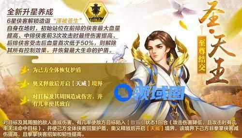《侠客风云传OL》中的圣·天王,于无名绝壁处顿悟,结合万物造化之象,创出的一部绝学。修习之时,更要聚众生念力,借天地之势,增强自身,虽千难万险,但小成之后即可内外练达,修成无漏之身,诸邪不侵,诸恶不近。传闻大成之时,便可成为天命之人,洪运齐天,福泽众生。
