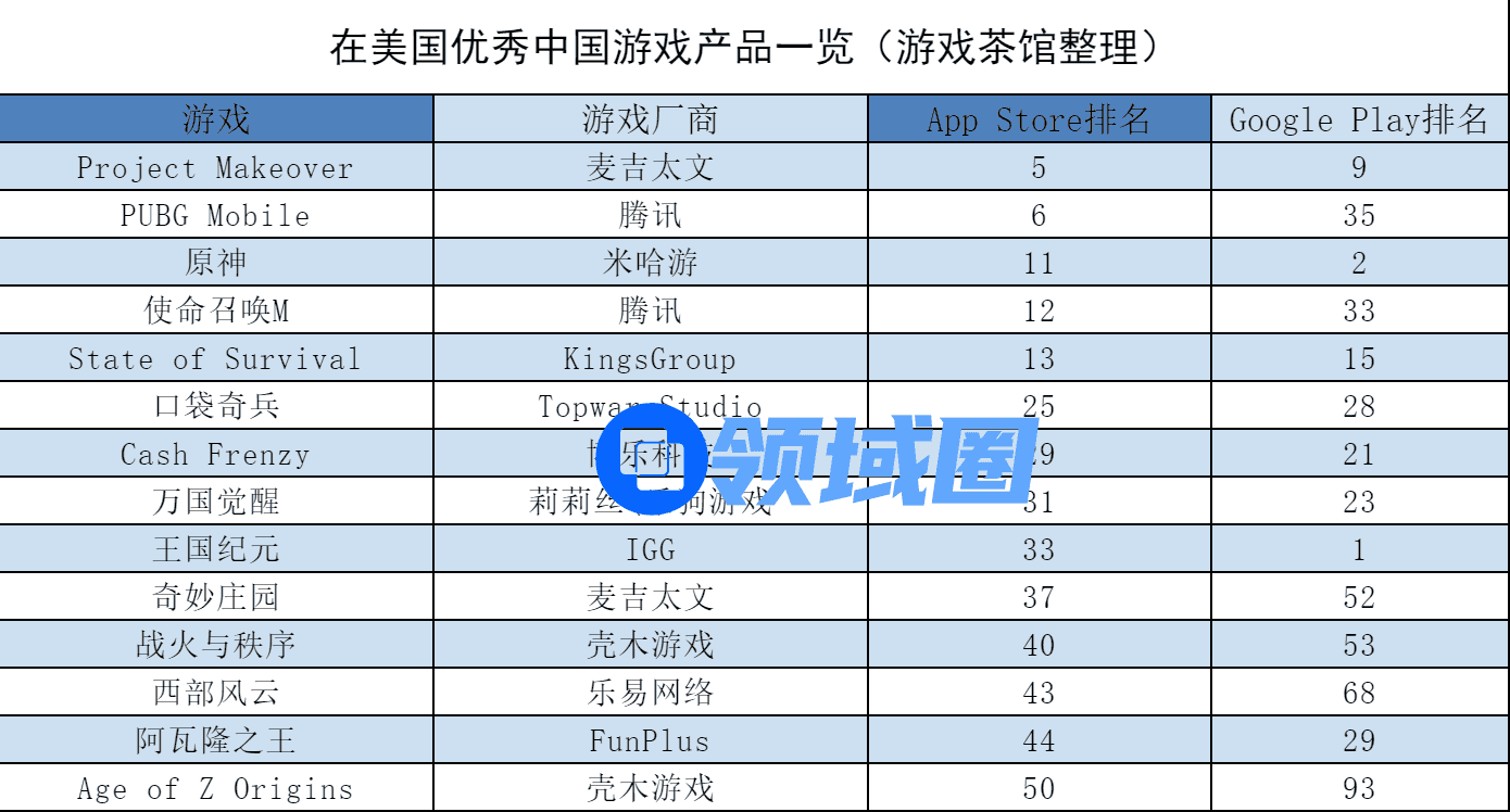 在本期榜单上,麦吉太文的《Project Makeover》和腾讯的《PUBG Mobile》分别是出海美国、德国市场的收入冠军。