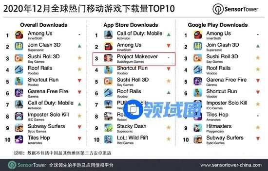 下载榜上,《Among Us!》《屋顶棍棍侠》《Sushi Roll 3D》分别排名前三。《Project Makeover》位列第四。有意思的是,模仿《Among Us!》玩法、但做了3D化改良的《Imposter Solo Kill》跻身下载量前十。据Sensor Tower数据,该游戏12月全球下载量达1600万次。