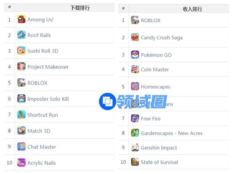 据App Annie发布的12月美国手游指数,《Among Us!》和《ROBLOX》分别是下载量和收入的第一名。