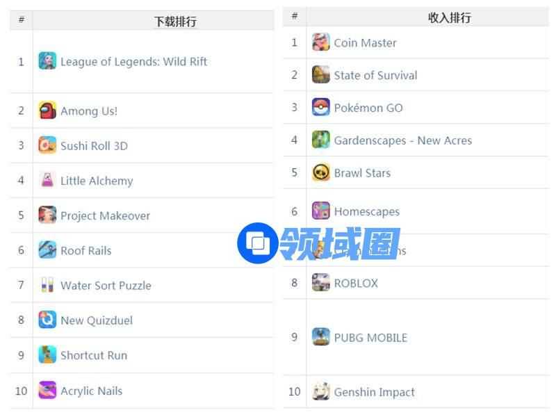 下载榜上,《英雄联盟手游》《Among Us!》《Sushi Roll 3D》分别排名前三。《英雄联盟手游》目前在欧洲和亚洲部分地区开测,是上月欧洲最火的MOBA手游。Sensor Tower的数据显示游戏iOS版下载量达360万次,不过欧美玩家是否能喜欢手机上的MOBA游戏还需继续观察。