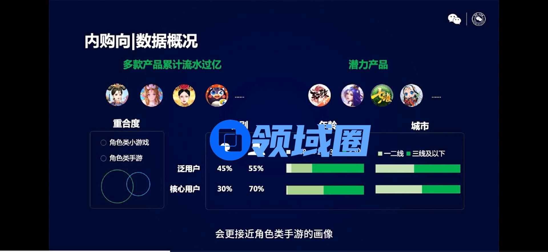在公开课中,微信还对平台用户进行了一个细分整理,向开发者们展示了一个更加清晰的用户生态。在以角色类产品为代表的重度游戏方面,泛用户男女比例更为接近,30岁以上用户占比过半,三线城市以下的用户占比更高,而核心用户画像则更接近角色类手游用户,男性为主,年龄以18-30岁和30岁以上为主,且一二线城市占比更高。