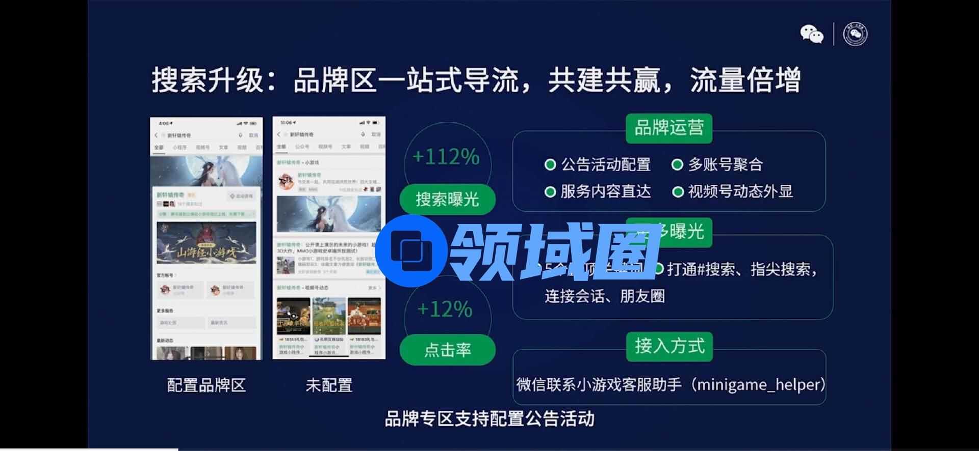 在搜索服务中,平台开通了品牌区服务,整合了小程序、公众号、视频号等离散式的多个搜索结果,品牌专区还支持配置公告活动,且能够同时展示多个官方账号的结果,给游戏品牌提供了更多的运营空间,而且这些服务项都可灵活自定义配置,产品开发者和运营方均可按照自己的需求进行展示。