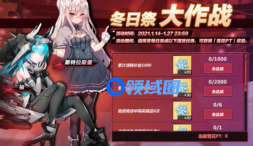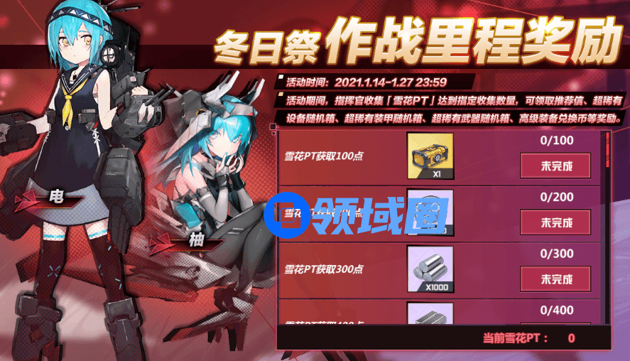 1月14日更新维护后 - 1月27日23:59期间,玩家每日完成指定任务,可获得「雪花PT」奖励,通过活动收集「雪花PT」完成活动任务里程碑,达到相关收集数量可获得推荐信、高级装备兑换币等奖励。