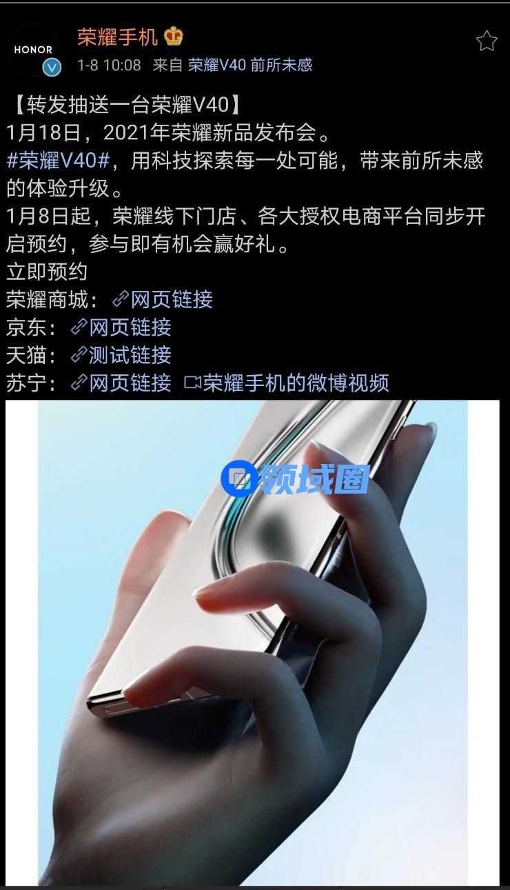 1月8日,@荣耀手机 官方微博正式宣布,将于1月18日举行2021年荣耀新品发布会,并正式推出外界期待已久的荣耀V40手机。官方信息显示,此次荣耀V40起用全新的产品slogan“前所未感”,相信其将为用户带来前所未有的使用感受。目前,这款产品已于线上线下渠道全面开启预约。