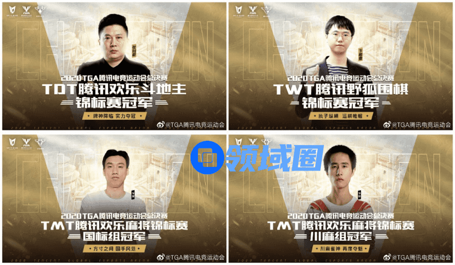 历经24天鏖战,2020 TGA腾讯电竞运动会(简称TGA)总决赛在北京落下帷幕,赛事全程同步线上直播,为亿万观众带来了一场精彩的全民竞技体育盛宴。腾讯棋牌锦标赛作为TGA总决赛舞台上参赛人数最多的赛事系列,吸引了众多棋牌玩家的目光,其中,张钊菥以超两万分的绝对优势收获2020 TDT腾讯欢乐斗地主锦标赛(简称TDT)总决赛的冠军。2020 TMT腾讯欢乐麻将锦标赛(简称TMT)总决赛的国标组冠军和川麻组冠军则分别由李健和李旭接连斩获。2020 TCT腾讯天天象棋锦标赛(简称TCT)的冠军被靓靓伐木累队的八位青年才俊纳入囊中。2020 TWT腾讯野狐围棋锦标赛(简称TWT)冠军则由职业围棋选手卞相壹获得。