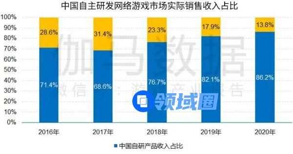报告显示:近年来,中国自主研发网络游戏收入连续多年快速增长,自主研发游戏产品在国内市场占比已达86.2%。从21世纪初的代理海外游戏为主慢慢转变为游戏开发强国,国内市场已经被高度发展的国内游戏企业所占据主导地位。